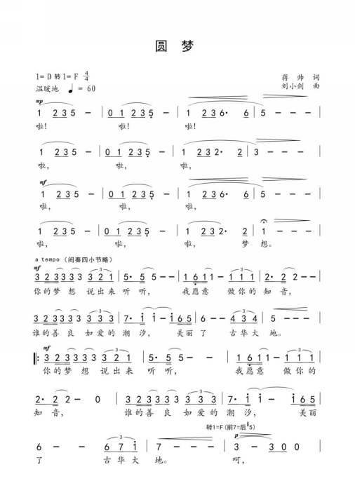 《圆梦》是“东方美谷·风雨彩虹——圆梦行动在贤城”公益活动的主题歌,这首歌由奉贤词作者蒋帅、曲作者刘小剑创作。歌曲于2010年12月创作出来后,经过多次的调整、修改和润色,成为每年圆梦活动暖场的歌曲。整首歌曲从“你的梦想说出来听听,我愿做你的知音”开始,歌词情深意长,充分流露出了人间处处有真情和大爱无疆之感,曲调则时而舒缓、时而昂扬,优美流畅更是激励人心。